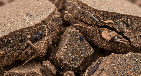Close-up view of dry, crumbling soil clumps featuring deep cracks and fissures. The detailed texture highlights the arid nature of the ground, symbolizing drought, geology, or agriculture issues.