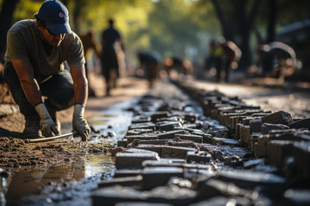 A dedicated construction worker is seen expertly handling muddy terrain at a construction site. Dressed in a helmet and work gear he kneels close to the ground focused on his task as he uses his hands to manipulate the wet soil. The surrounding area shows signs of ongoing construction with machinery in the background and orange barriers marking the site