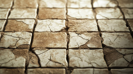 Detailed view of broken tiles lined up, showing cracks, chipped edges, and dust for a demolition theme