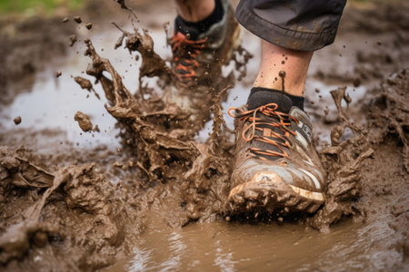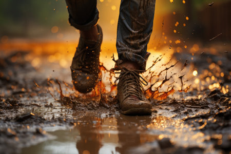 A person is walking through a muddy path with their feet splashing water. The scene has a playful and adventurous mood, as the person seems to be enjoying the experience of walking through the wet
