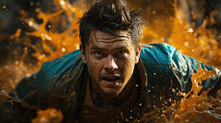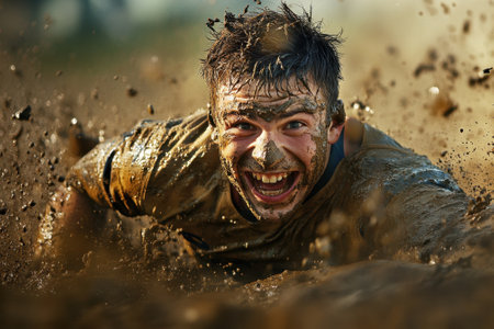 A man in a blue shirt running through mud, AI