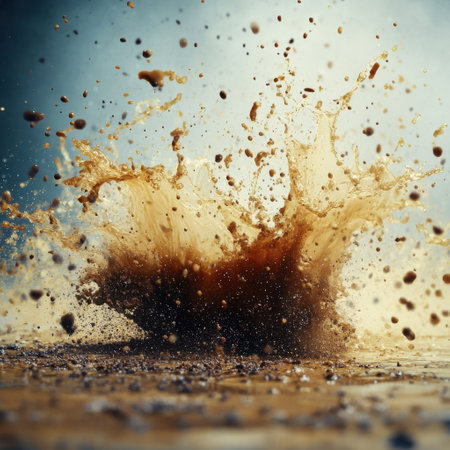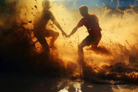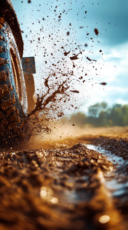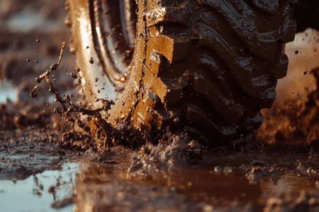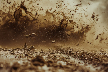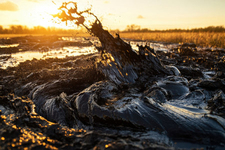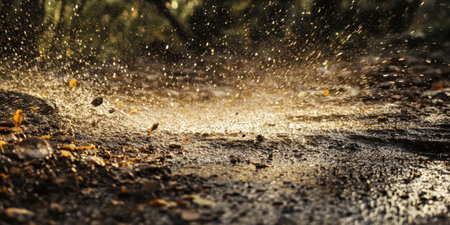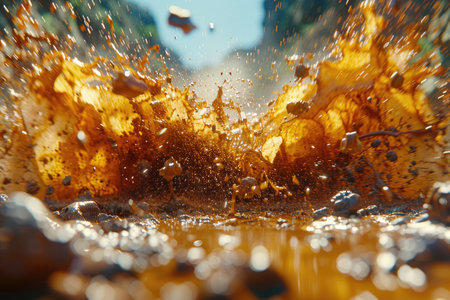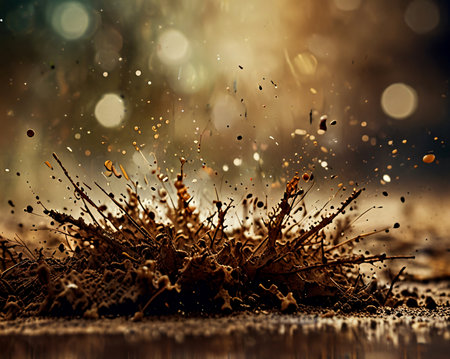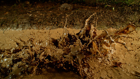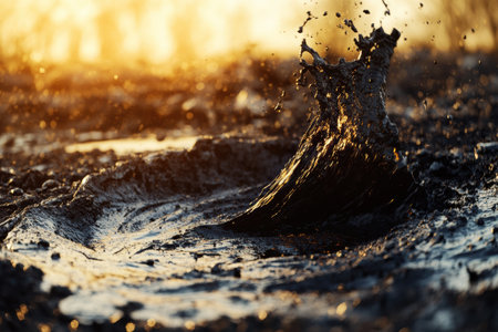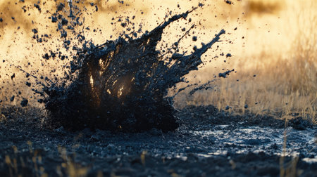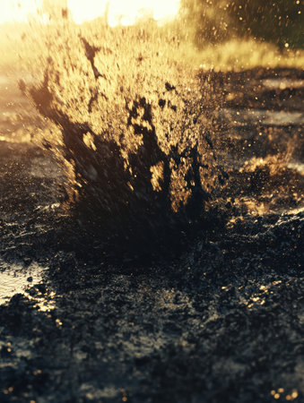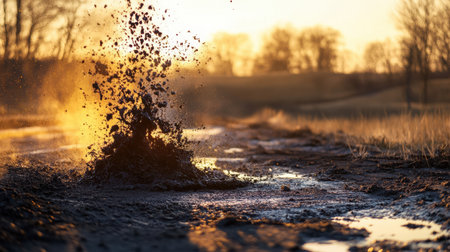 Mud splashing dynamically with golden sunlight reflecting