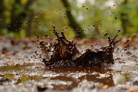 Dynamic and messy mud splash in nature, close up on the forest floor, with wet soil and water droplets creating a vibrant and abstract pattern in the outdoor environment