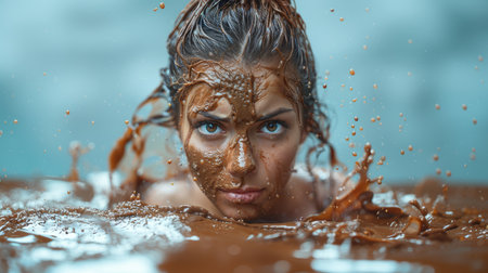 Close-up of a woman with an intense expression, partially submerged in a dramatic splash of chocolate-colored liquid, conveying emotion and energy.