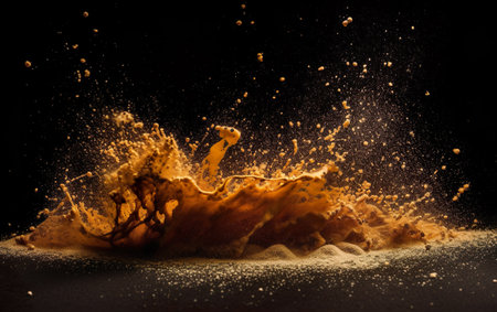 Sand explosion, golden grains dispersing on black background
