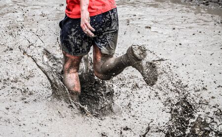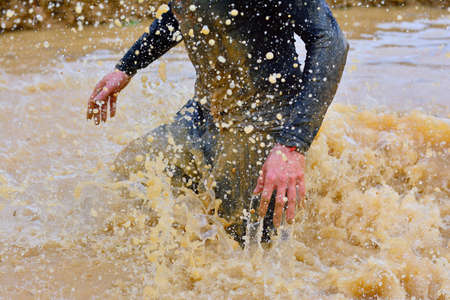 A participant of a physically demanding run, runs through the mud