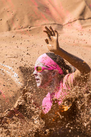 Hampton, GA, USA - April 23, 2016: A woman splashes muddy water as she lands in a mud pit at the Dirty Girl Mud Run obstacle course event on April 23, 2016 in Hampton, GA.