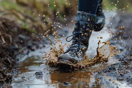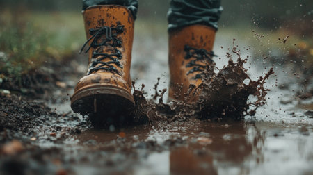 A person splashes through a muddy puddle in vibrant waterproof hiking boots. The boots create a dynamic scene, showcasing adventure and exploration in nature.
