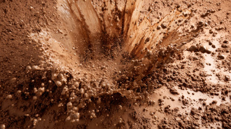 A chocolate mixture splashes dramatically creating intriguing patterns and textures on a brown surface. The vibrant color contrasts beautifully with the surrounding area and captures attention.