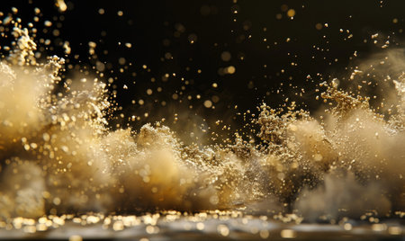 A stunning image depicting a splash of liquid gold surrounded by fine particles, set against a dark background, showcasing motion and mesmerizing texture.