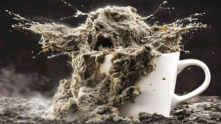 Coffee cup from which a monster emerges with splashes and steam on a dark background