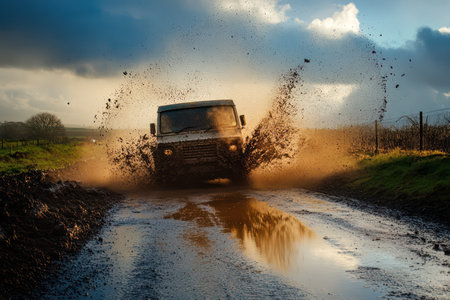 A robust off road vehicle kicks up mud and water as it navigates a puddle in a rural area during late afternoon. The golden sunlight highlights the splashes and rugged terrain.