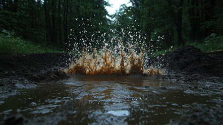 Splashing mud and water in forest path capturing the essence of nature's raw beauty during a rain-soaked day with vibrant green surroundings
