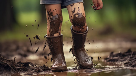A child wearing dark pants and muddy rubber boots jumps into a large, brown, muddy puddle. The action creates a dynamic splash, with water and mud droplets frozen in mid-air.