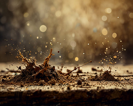 Dynamic close-up of dust and soil erupting from the ground, showcasing the raw energy of nature. Perfect for themes of agriculture, construction, and earth.