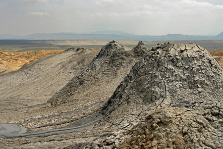 Beautiful mud volcanoes in the mountains near the village of Alyat. Azerbaijan.
