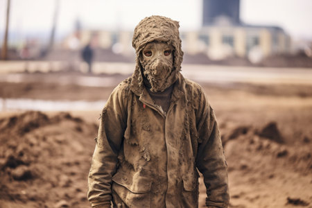 a man wearing a mask standing in the mud