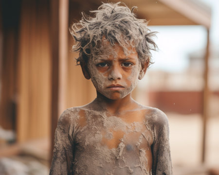 a young boy standing in the dirt with mud on his face