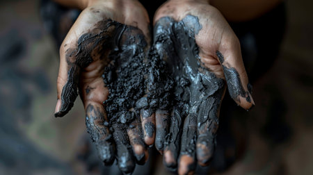 Human Hands Covered in Black Clay Mud