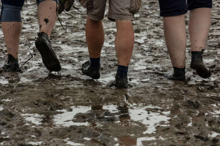 Shallow depth of field (selective focus) image with the mud on an unpaved road during a rainy summer day at a music festival.