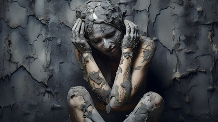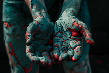 A striking close-up shows two hands covered in cracked, blue-grey material, with vibrant red peeking through the cracks. The dark background accentuates the skins texture and colors, offering complex emotion.