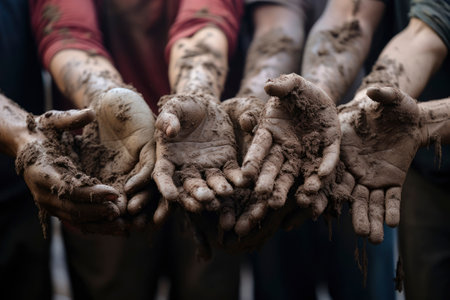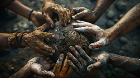 A close-up of a man's hands covered in mud, showing the hard work and effort they've put in.