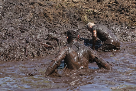 Muddy obstacle race runners in action. Mud run.