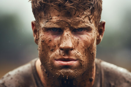 Intense gaze of a determined young person covered in dirt