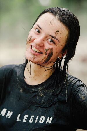 KYIV, UKRAINE - July 22, 2017: The woman the winner after overcomes a water mud barrier during power race Legion Run, taken place in Kiev, Ukraine, on July, 22nd, 2017