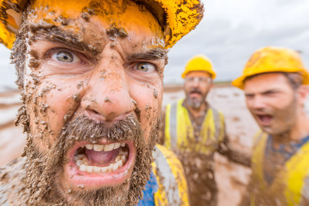 Group of workers having fun at a construction site in the mud.