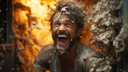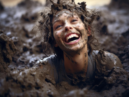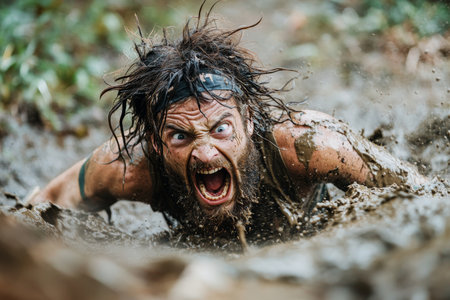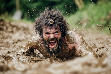 Adventurous bearded man with wild hair crawling in mud at race, expressing fun and excitement