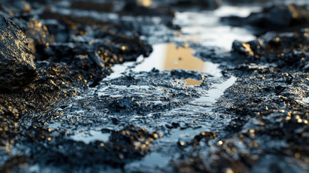 Close-up view of textured wet soil showcasing muddy water puddles and scattered stones, ideal for illustrating natural landscapes and earth sciences.