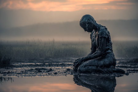 A somber, seated sculpture gazes downward amid still waters that mirror a vibrant sunset, evoking themes of reflection and quiet sorrow.