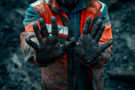 Freshly excavated coal held hands miner illustrating hard work and grit associated coal extraction. miner’s hands are covered coal dust emphasizing labor involved.