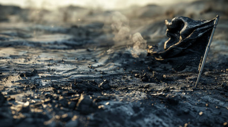 Smoke rising from the ground as a tattered black flag waves on a desolate battlefield, symbolizing loss and destruction after war