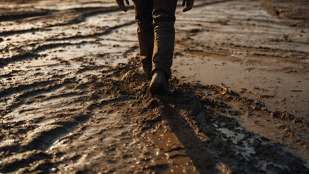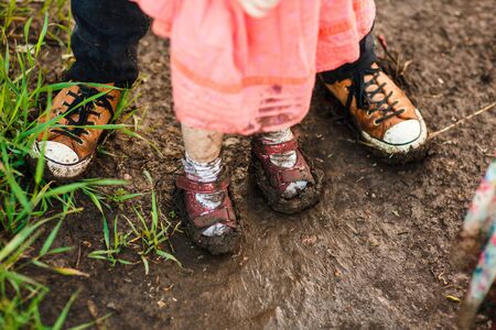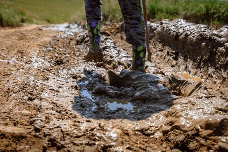 dirty shoes. goes in the dirty dirt road. earth after a rain. off-road. near a field.