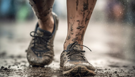 close up shot of a rugby player s muddy legs, capturing the intensity and determination of the sport.
