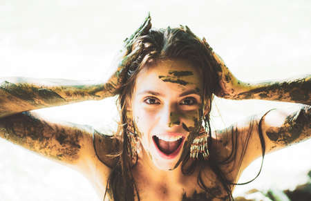 Portrait of Caucasian Girl Smeared in a Healthy Black Mud