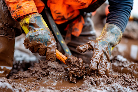 Builders wearing protective gloves labor in thick mud, skillfully excavating the ground. The challenging conditions reveal their determination and commitment to the project.
