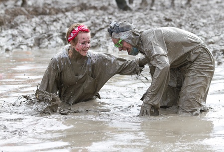 GIJON, SPAIN - JANUARY 31, 2016: The Farinato Race, a extreme obstacle race, celebrated in Gijon, Spain, on January 31, 2016. Dirty man helping woman to crawling under a barbed wire in the race.