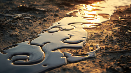 Close up of mud in a puddle after the rain at sunset
