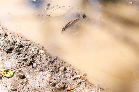 Close-up of a cloudy creek on a stale brown soil