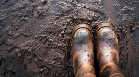 Muddy boots on ground covered with wet soil