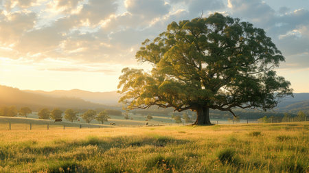 Pastoral Elegance at Dawn or Dusk: A Majestic Tree Stands Aglow Amid Rolling Hills with Grazing Farm Animals