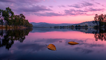 A tranquil lake scene at sunset. The water is still and reflects a vibrant pink and purple sky. Two fallen leaves rest gently on the water's surface. Tall trees line the shore. The image is ideal for commercial or editorial use. Perfect for showcasing nature, peace, or calm in outdoor settings.