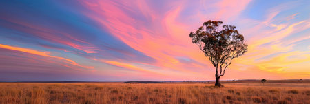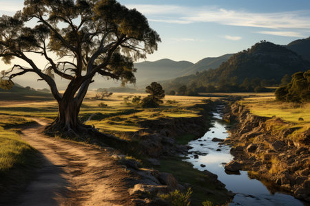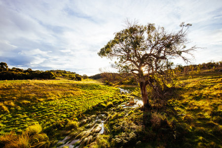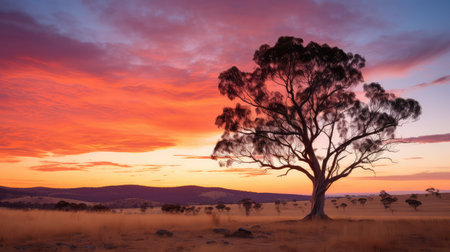 Picturesque landscape of Australian outback with tall eucalyptus tree on sunny day