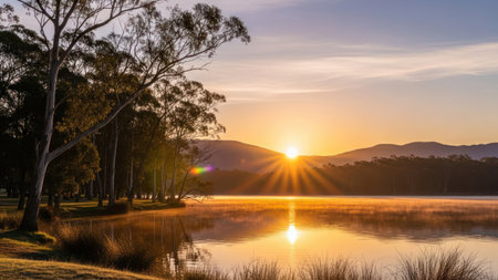 The sun rises over a tranquil lake, reflecting the golden light onto the water. Silhouette trees frame the scene, with gentle mist rising from the surface. Distant mountains complete the scenic backdrop creating a sense of peace and natural beauty. The sky transitions with warm colors.