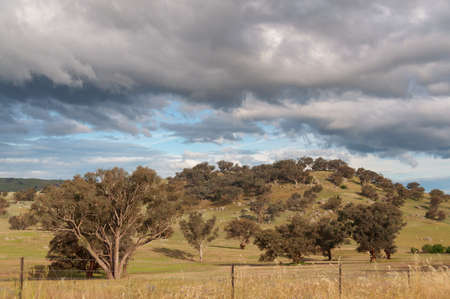 Nature landscape of hill paddock, pasture farmland with dramatic clouds above