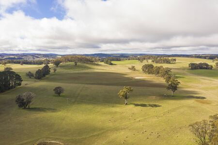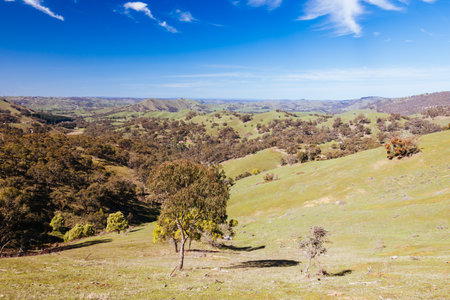 Australian countryside landscape as viewed from the car during a road trip in Tasmania, with dry land and eucalyptus trees