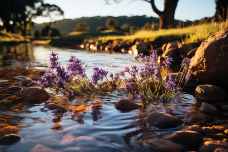 Lavender field next to the serene stream under the Sun West., generative AI